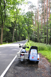 Langsam nähere ich mich der wunderschönen Seenplatte um Müritz. Nur kurz lässt sich Wasser sehen. Was mich immer wieder verwundert ist, das es kaum Verkehr gibt. Ab und an ein paar Radwanderer und selten ein paar Motorräder geschweige denn Gespanne. Das einzige Gespann das ich bisher gesehen hatte war in Rostock ein Russengespann.