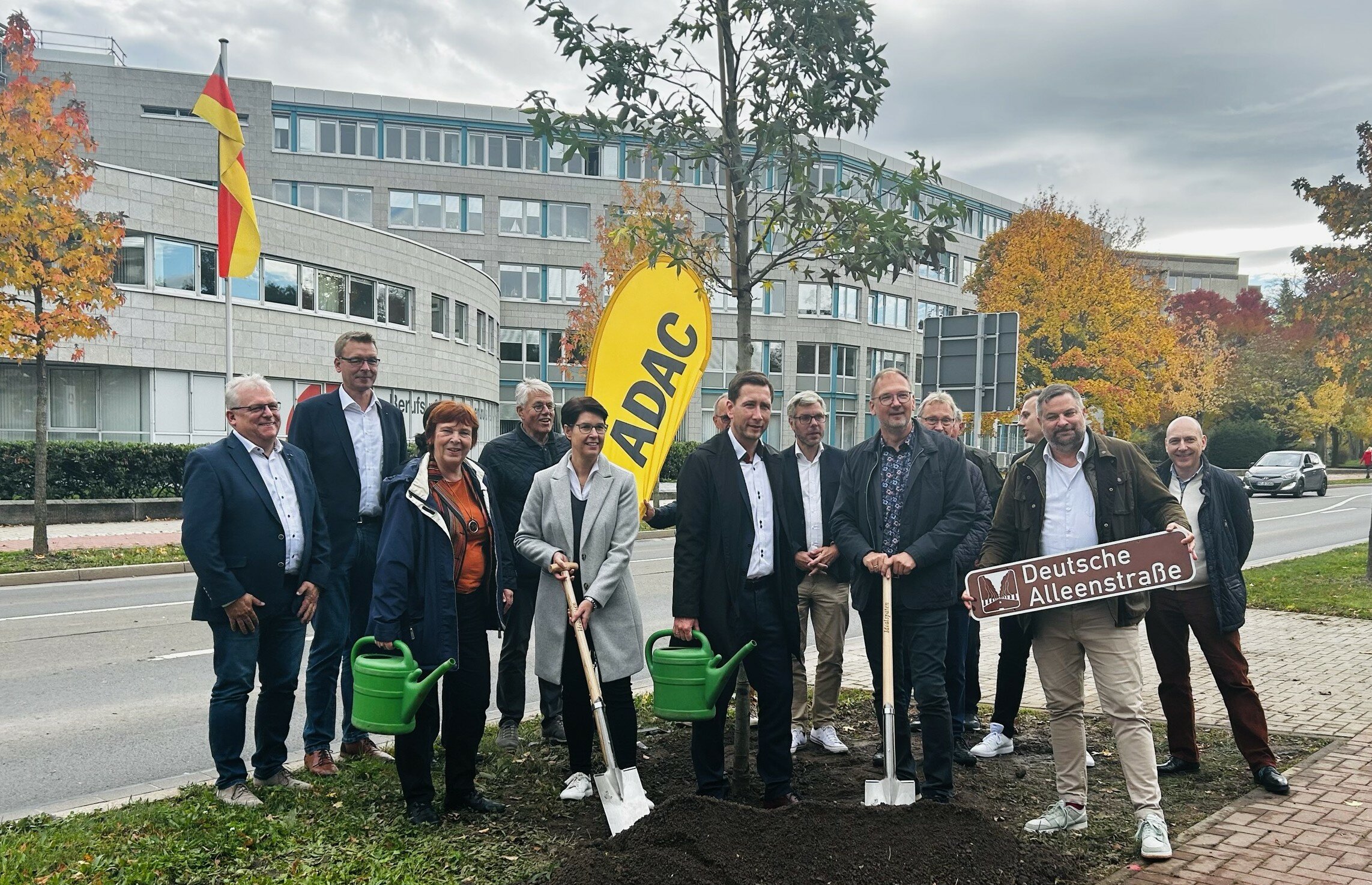Zuwachs für die Deutsche Alleenstraße: vier neue Bäume in Halberstadt. Irene Mihlan, Vorständin Touristik des ADAC Niedersachsen/Sachsen-Anhalt und Schatzmeisterin der Arbeitsgemeinschaft (vordere Reihe, 1.v.l.), hat gemeinsam mit dem Bundesgeschäftsführer der Schutzgemeinschaft Deutscher Wald, Christoph Rullmann (vordere Reihe, 1.v.r.), dem Oberbürgermeister der Stadt Halberstadt, Daniel Szarata (vordere Reihe, Bildmitte), dem Vorsitzenden des Landestourismusverbandes Sachsen-Anhalt, Lars-Jörn Zimmer (MdL) (vordere Reihe, 2.v.r.), sowie der Geschäftsführerin des Harzer Tourismusverbandes, Carola Schmidt (vordere Reihe, 2.v.l.) die Pflanzaktion begleitet.