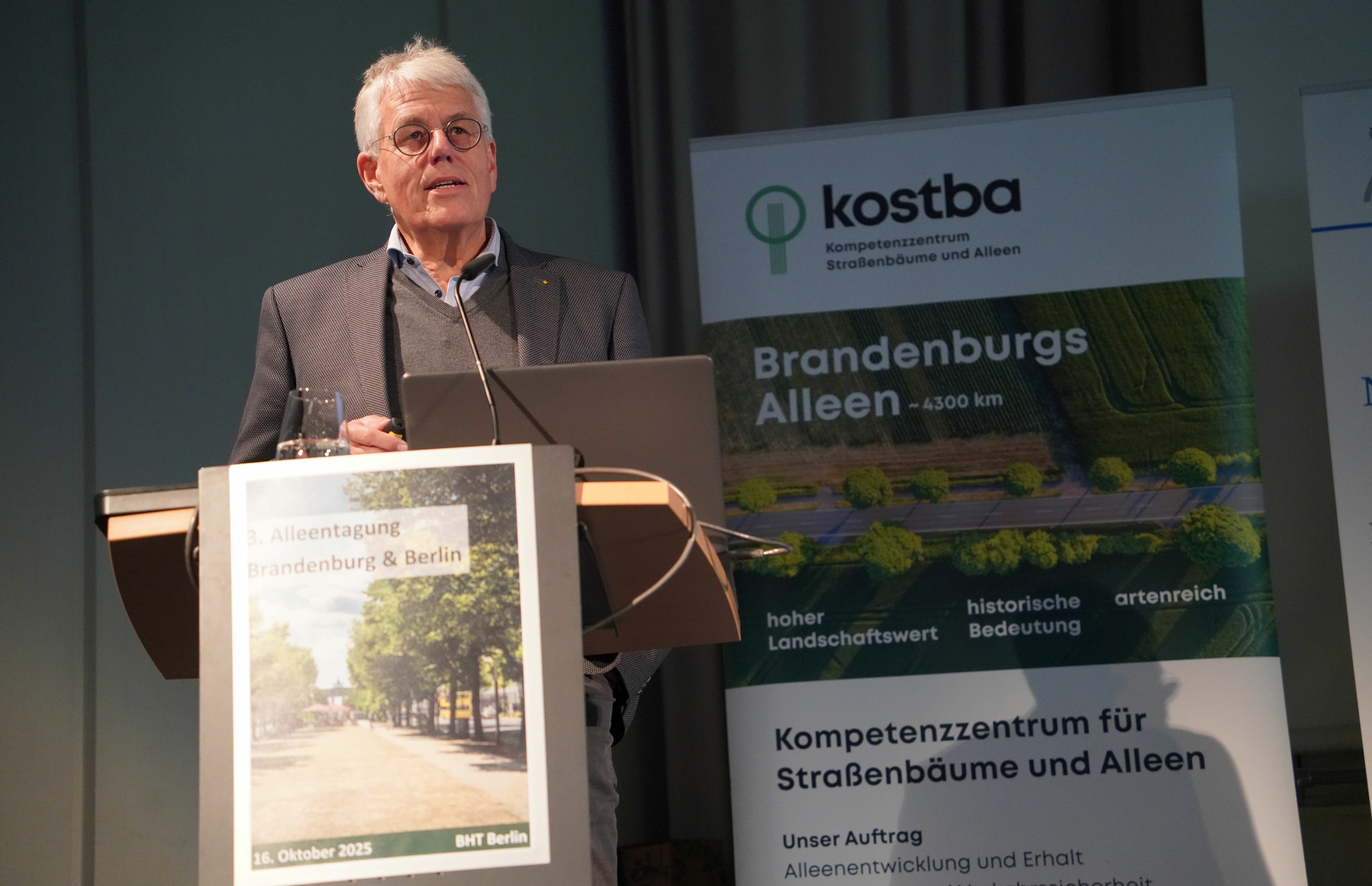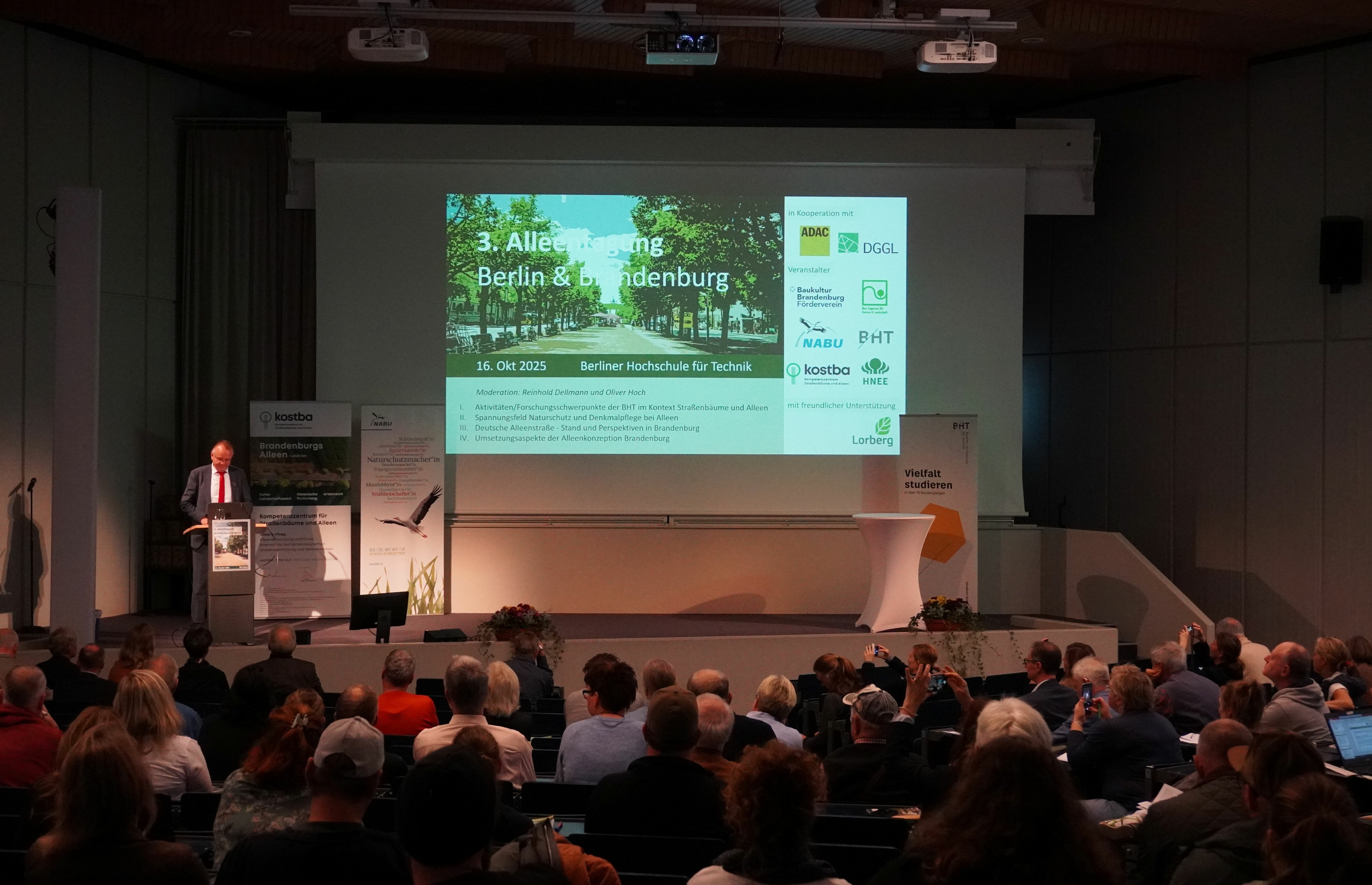 Am 16. Oktober 2025 fand in den Räumlichkeiten der Berliner Hochschule für Technik (BHT) die 3. Alleentagung Berlin & Brandenburg statt. Rund 130 Fachleute aus Wissenschaft, Verwaltung, Politik und Praxis kamen in der Berliner Hochschule für Technik (BHT) zusammen, um sich über den Erhalt und die nachhaltige Entwicklung der Alleen auszutauschen. Eingeladen hatte das Kompetenzzentrum Straßenbäume und Alleen (kostba) gemeinsam mit dem Fachverband Garten-, Landschafts- und Sportplatzbau Berlin und Brandenburg e.V. (FGL), dem NABU Brandenburg und NABU Berlin, dem Förderverein Baukultur Brandenburg.